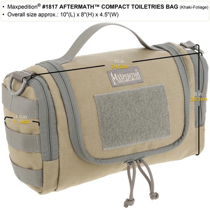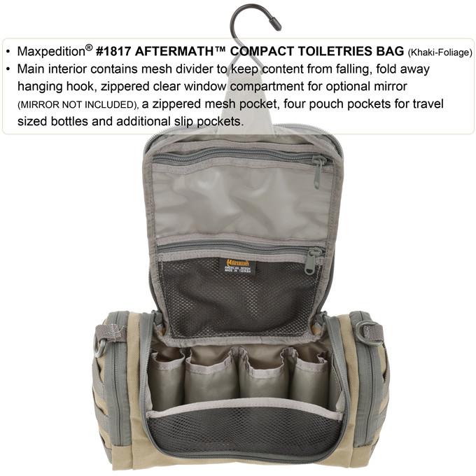 A great travel essential for carrying shampoo bottles, tooth brush, cologne, and other personal items in a compartmentalized fashion. The fold away hook makes it possible to hang the Aftermath in the shower and an internal zippered clear window compartment allows for an optional mirror (not included).