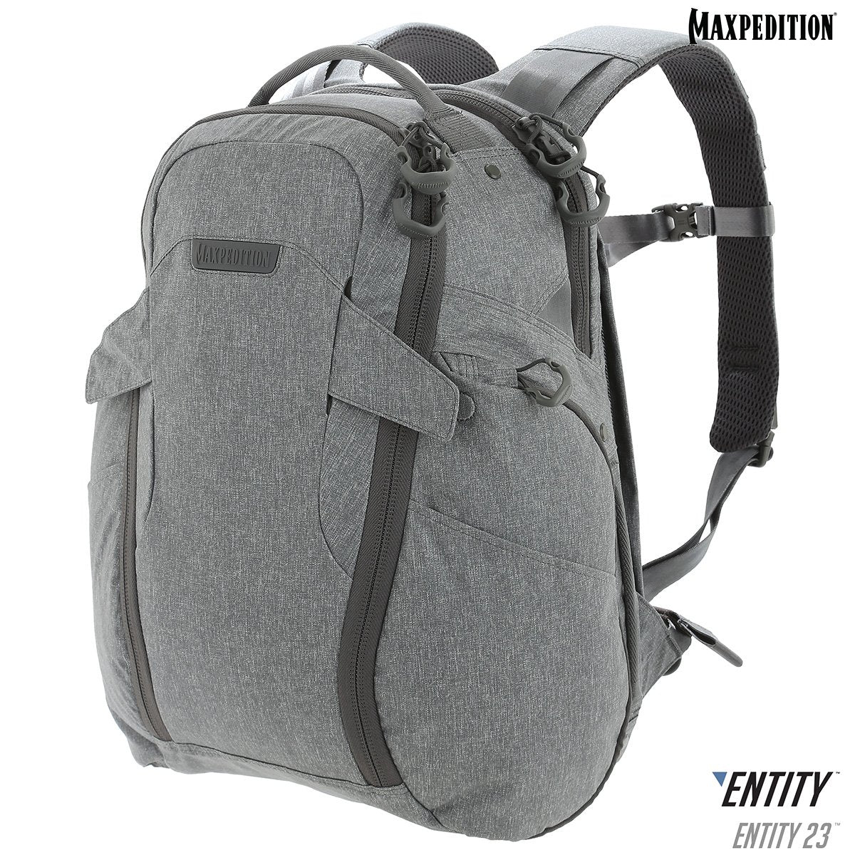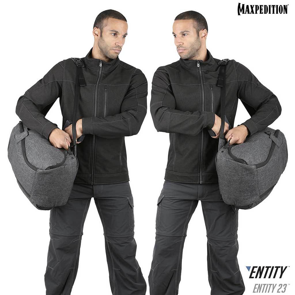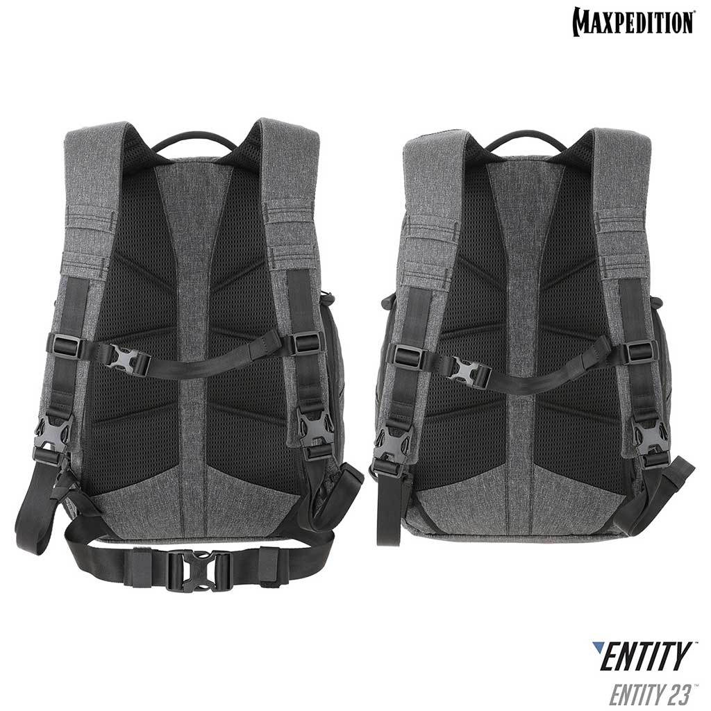 The Entity 23 is an ergonomic pack with padded shoulder straps and quick release buckles.  There is a dedicated locking and padded compartment, which can hold a 15” laptop.  The main compartment is also lockable, and has drawbridge straps for additional security.  The front exterior has tuckable magnetic wings for quick temporary closing of the main compartment.  The dual access rear CCW compartment is fully loop-lined, and a double-sided hook Security Lockout Strip is included.  Dual side ports are perfect for headphones, charger cables, etc.  A rear trolley handle pass-through allows for off body carrying while travelling.