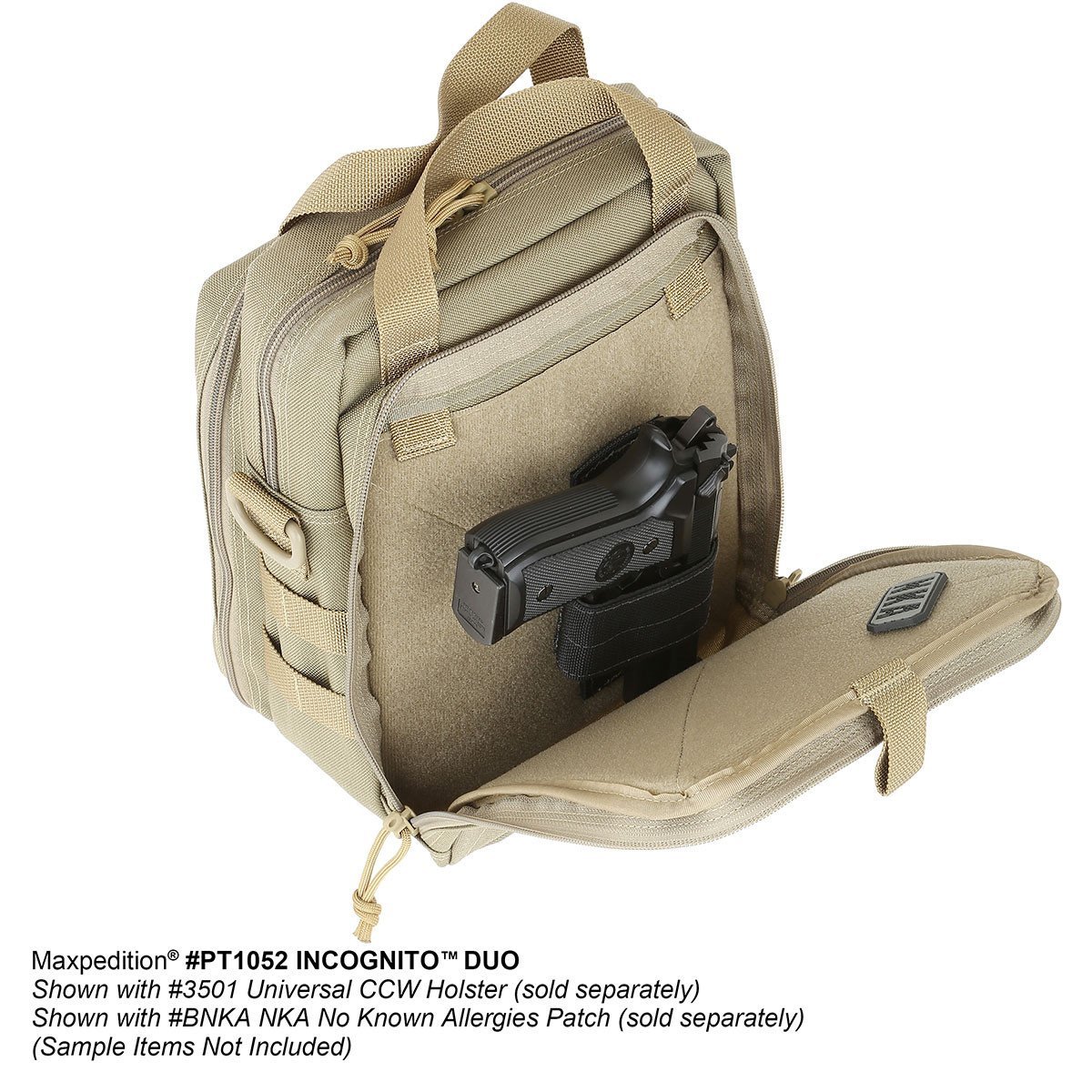 Padded tablet carrier with drawbridge admin pocket and fast opening concealed carry pocket.